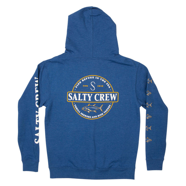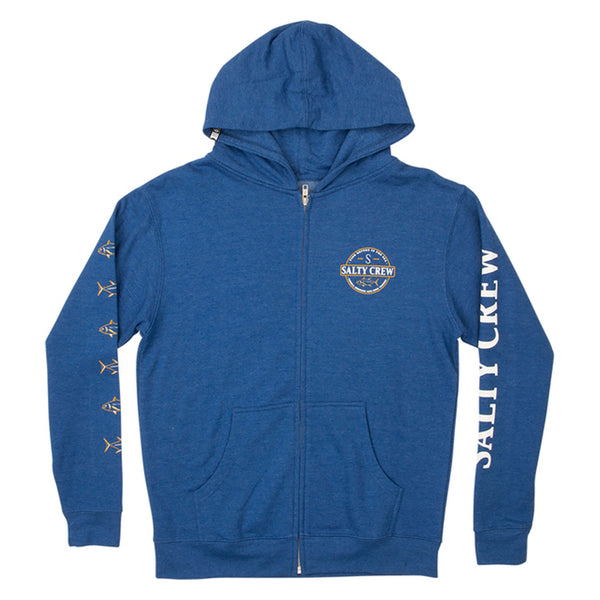 The Deep Sea Zip Fleece is a youth zip-up midweight hooded fleece with kangaroo pouch pocket and draw cord hood. Featuring custom Salty Crew screen printed graphics on the front, back, and sleeves.