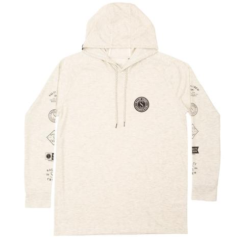 The Patchy Hood Tech Tee in colour Vintage WHITE. It has Blended fabrication with UPF 40+ Sun Protection and Patch on left chest. It also features Screen prints on sleeves and Speckled drawcord. L/S HOODED TECHNICAL TEE