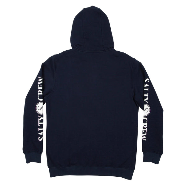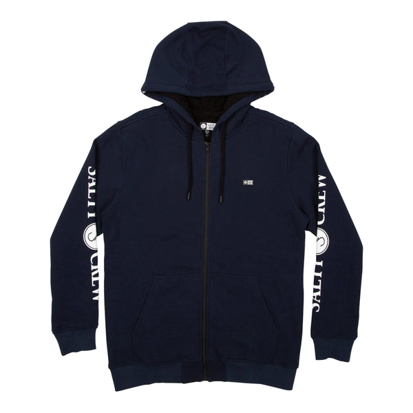 The Refuge Sherpa Fleece. Zippered hooded fleece with Kangaroo handwarmer pockets. Peached fleece with sherpa and taffeta lining. Salty Crew printed sleeves. Made from 80% Cotton / 20% Polyester.