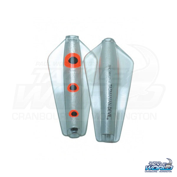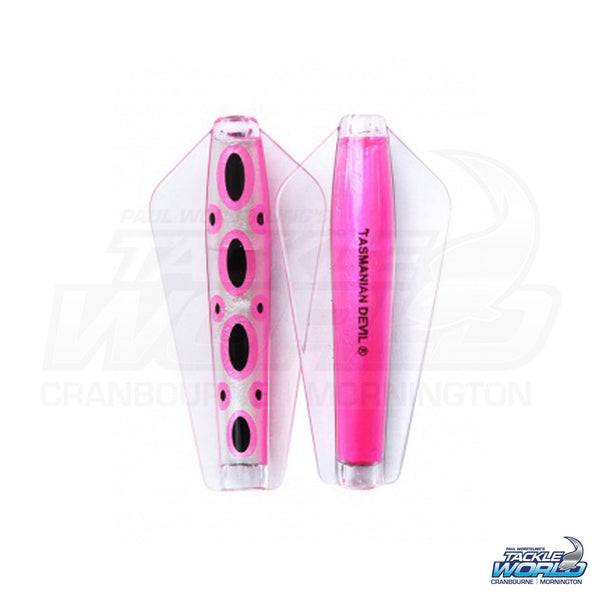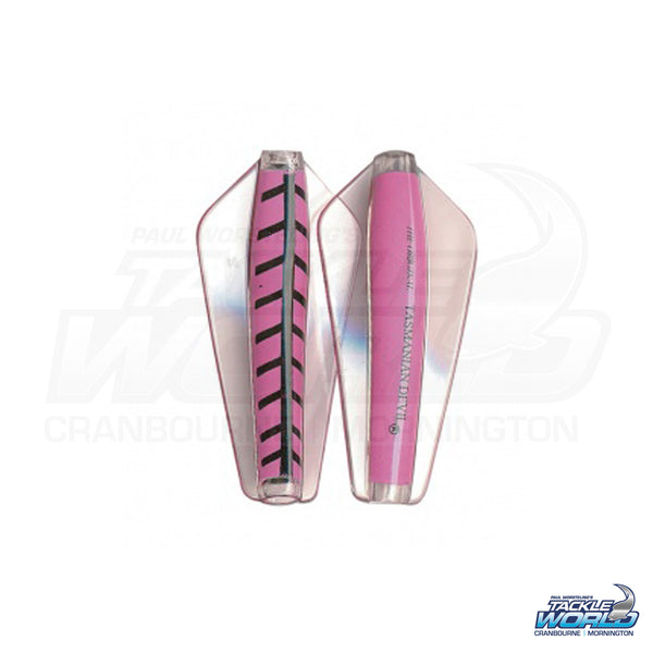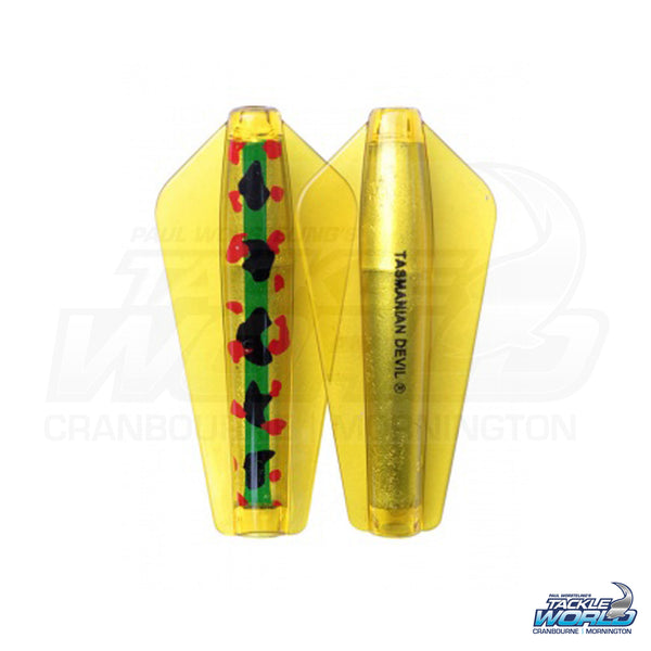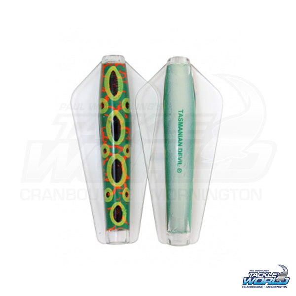 Tasmanian Devil lures are a unique Australian product designed for trolling, casting or jigging in fresh and saltwater. The lure action is due to the revolutionary winged technology that causes the lure to swim in an irregular manner, darting and diving, simulating the movement of wounded fish. This pulsating action is transmitted to the rod tip that will show as a nodding action, that is proof that the lure is swimming correctly. If this rod tip action is not present, either a piece of weed, or a fish is on the hook. All five sizes of the Tasmanian Devil swim in this erratic manner and this is the reason our lures are so effective. The loose flight stainless steel centre or the line-through rigging method used with the 7, 13.5, 20 or 26 gram version prevents fish from throwing the hook as both methods allow the lure body to slide up the line away from the fish. Regardless of the species that is targeted, the Tasmanian Devil qualifies as an all round lure. Whatever your quarry, from Brown trout and Rainbow trout to School Mackerel and Salmon, the Tassie Devil is a sure fire hit and will land you your target species time and time again. Effortless to cast, simple to troll and easy to jig.