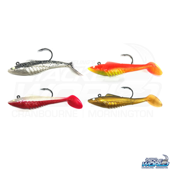 The Squidgies Slick Rig has quickly become one of Australia’s top-selling soft plastic lures since its release a few years ago. Anglers love the simplicity of a pre-rigged lure they can simply tie or clip on their lines or leaders and cast or troll to catch fish! But many specialist anglers, particularly those chasing fish like barramundi in freshwater rivers and dams or tidal estuaries, wanted additional colours in the line-up, and also a selection of Slick Rigs with lighter built-in weights. Thus was born the Squidgies Pro Slick Rig Light range! A fantastic colour range, and with inserts 45% lighter than the originals! Already the number one impoundment barra lure in the land, smart anglers are constantly finding new wonders to work with these fantastic swim baits… Smear and fill them with deadly S-Factor and go for it! Often, these great lures do their best work on a straight, slow to medium-paced retrieve, but don’t be afraid to experiment! Try stops and starts (burn-and-kill), lifts and drops, and slow jigging near the bottom… Each approach has its day!