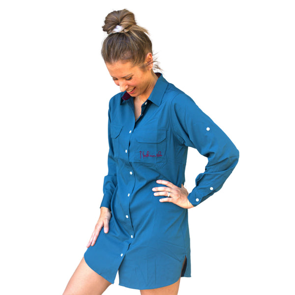 The shirt dress is designed to be a little roomy and effortless. This material is high performance UPF50+, light weight & stretch.